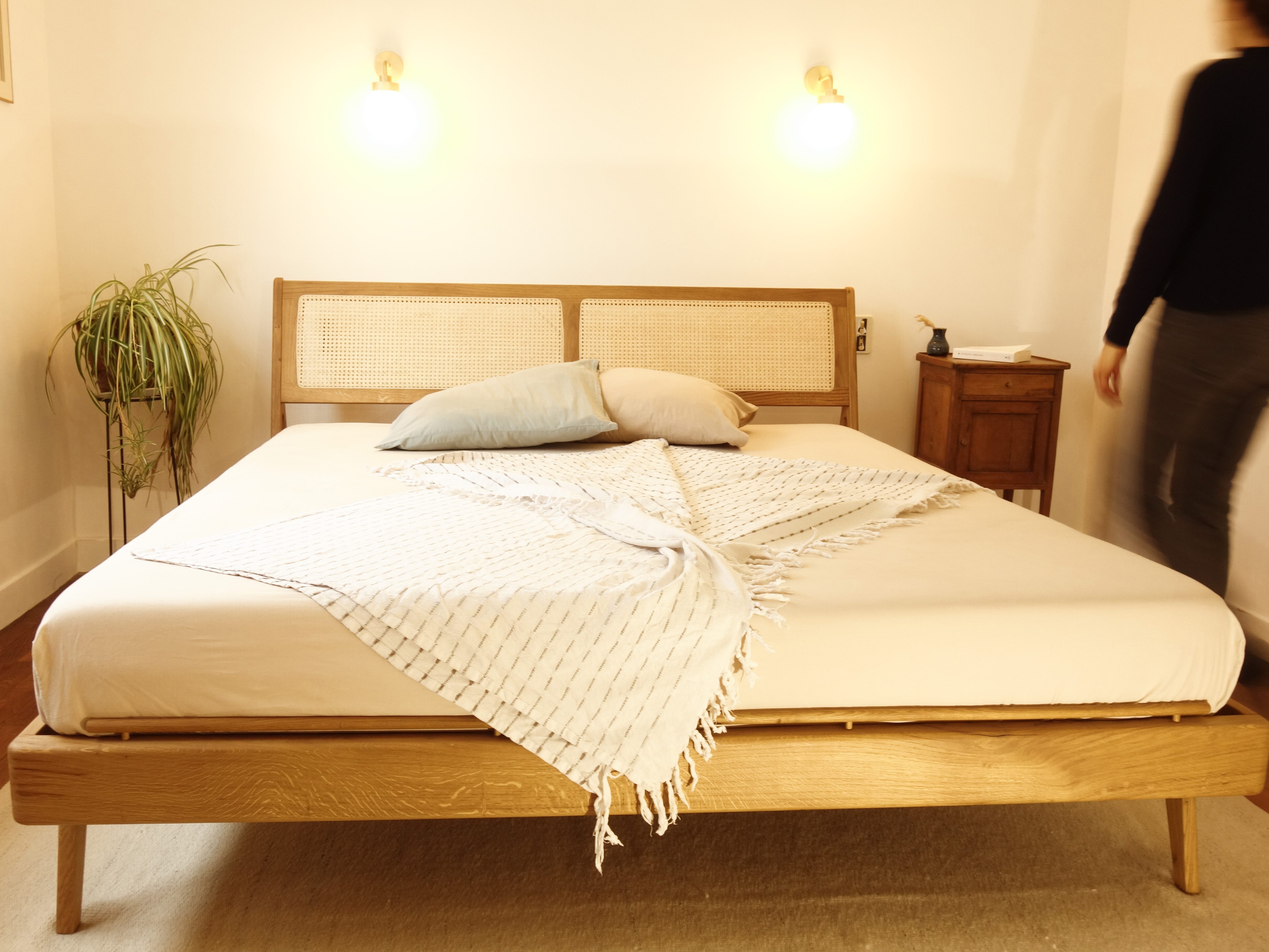 Lit double en chêne massif et cannage