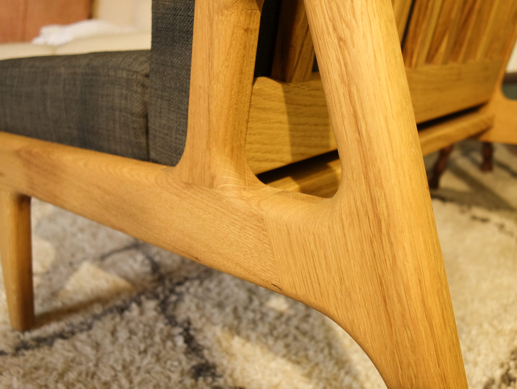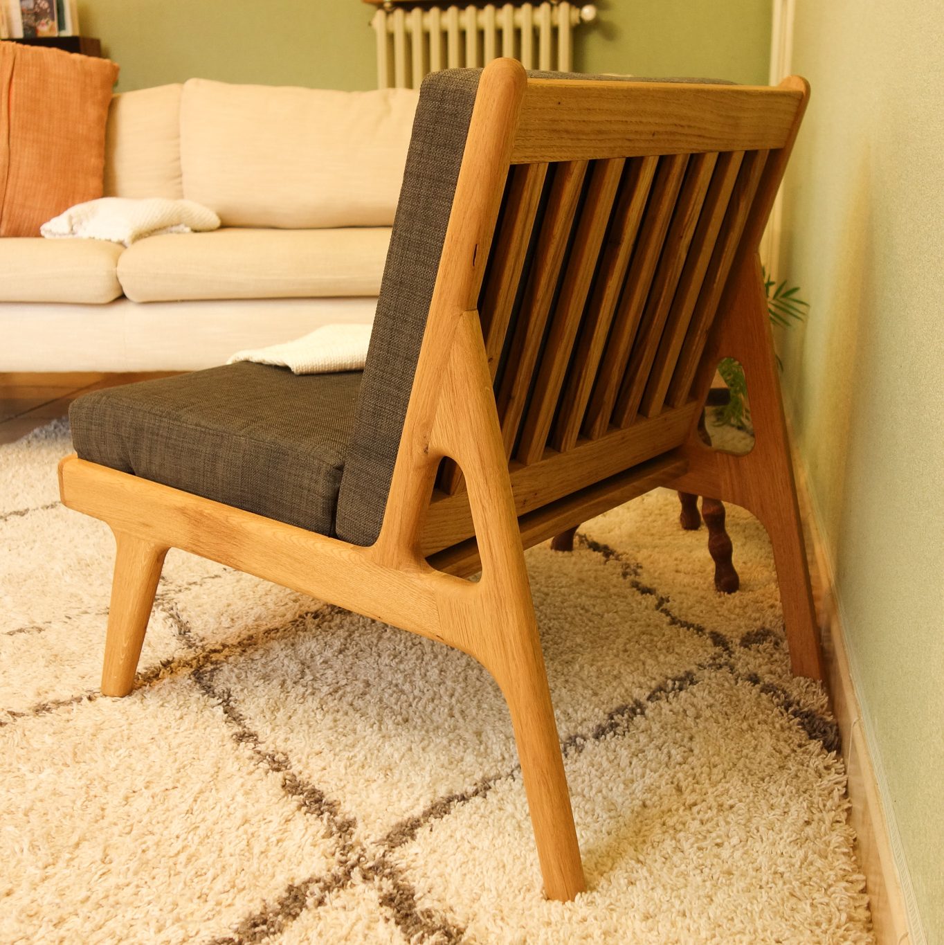 Fauteuil minimaliste aux angles arrondis, chêne massif.