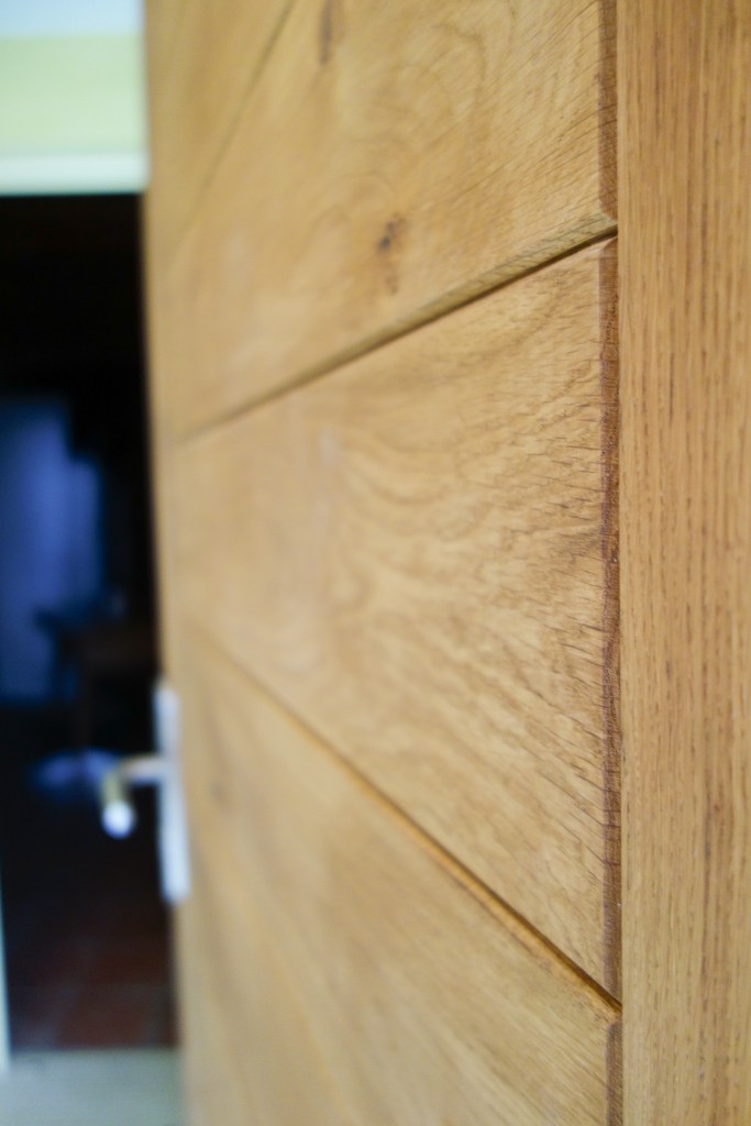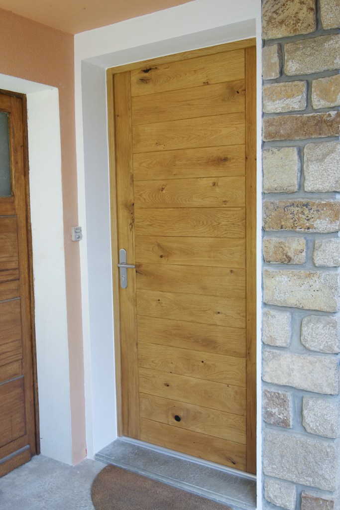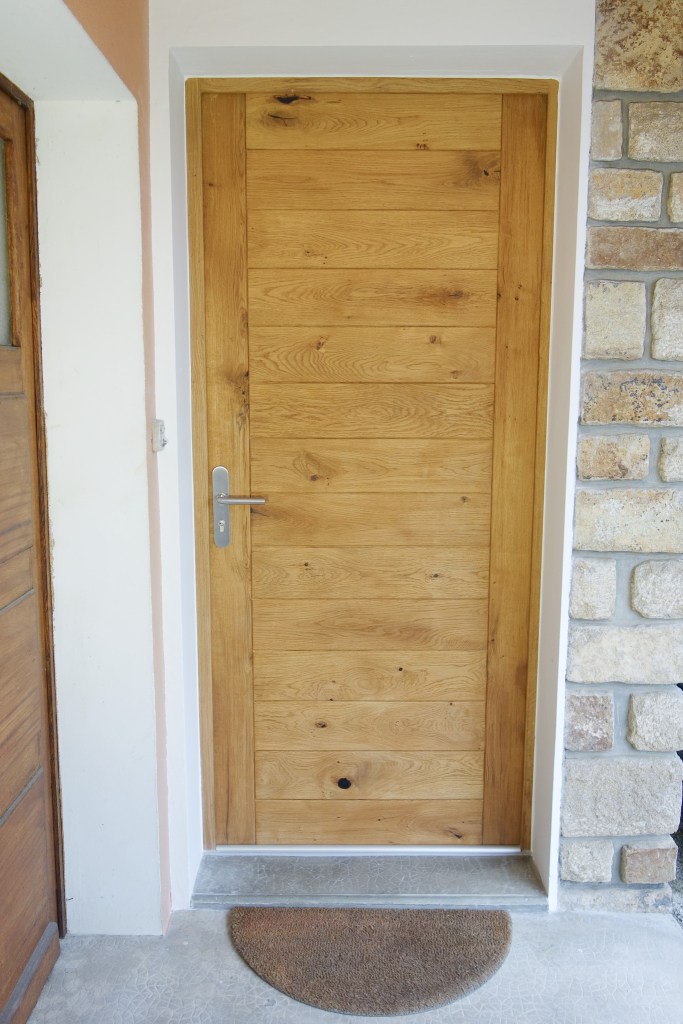 Porte d’entrée isolée. Serrure 5 points et doubles joints d’étanchéité sur dormant et ouvrant. 3cm d’isolant thermique recouvert d’un habillage en chêne massif.